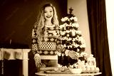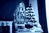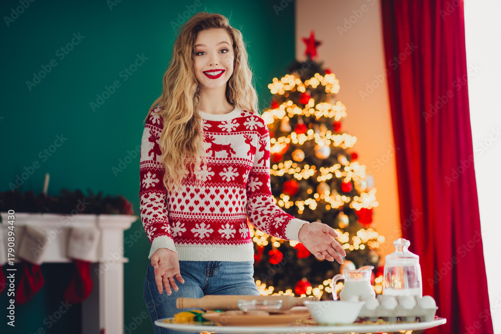 A cheerful woman in a red white Christmas sweater stands by a festive table with baking ingredients as a glowing Christmas tree lights up a cozy home scene for holiday celebration