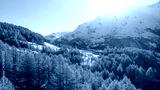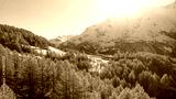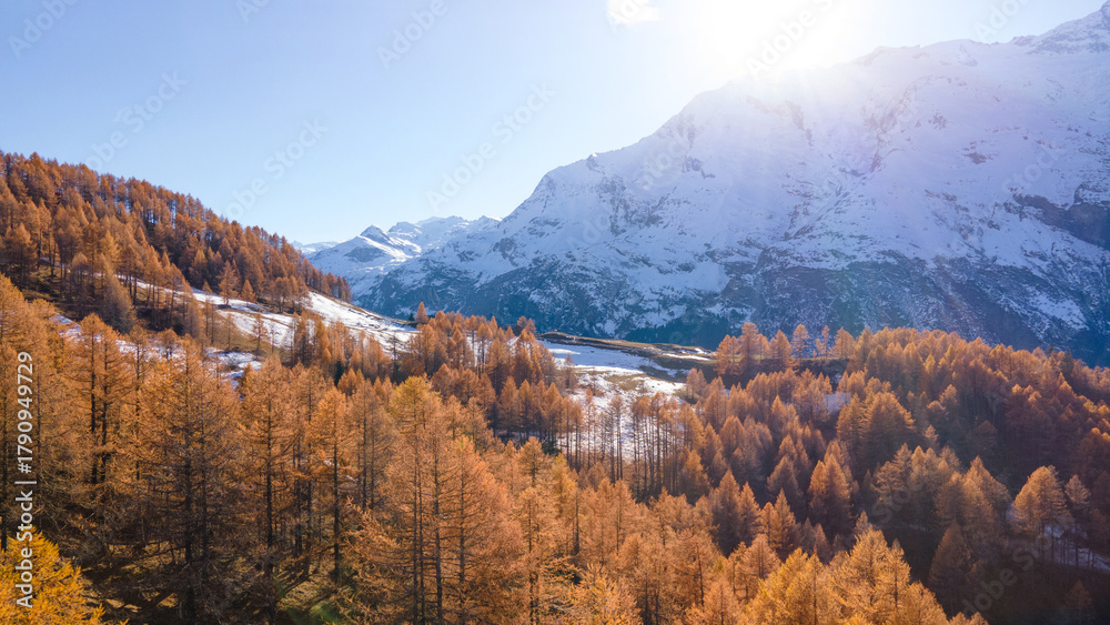 beautiful autumn landscape, yellow larch trees forest and white snowy mountains, fall season in Alps, France