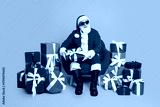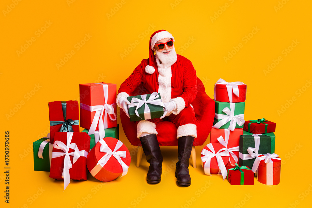 Santa with colorful gifts sits in bright yellow studio smiling during Christmas season with wrapped presents