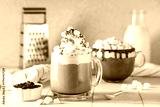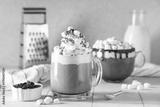 Glass cups of hot cocoa drink with whipped cream and marshmallows on white tile table