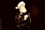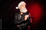 Cool Santa rocker in leather jacket with beard and hat holding sunglass against red studio background