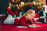 Young girl drawing at home beside a twinkling tree with gifts decorations and cozy holiday mood