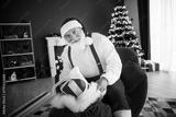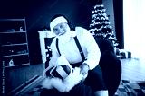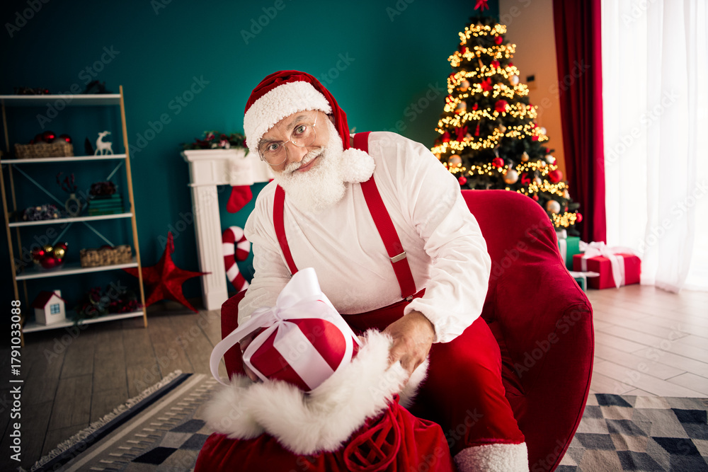 Santa sits in a red suit by a glowing Christmas tree at home as he unwraps a wrapped gift in a cozy festive room