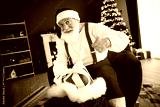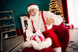 Santa Claus in a cozy living room gives a thumbs up while presenting a wrapped gift with a Christmas tree holiday decorations festive scene