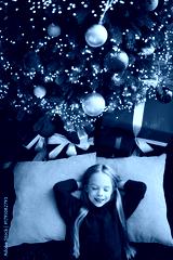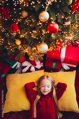 Dreamy Christmas night at home girl resting under tree with gifts and cozy lights