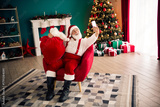 Santa selfie in a cozy Christmas living room with tree gifts and fireplace creating a warm festive mood for a family holiday scene