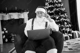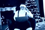 Santa works on a laptop in a cozy Christmas living room with a glowing tree gifts and festive lights