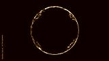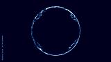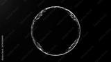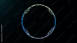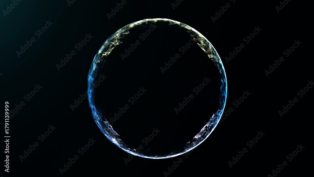 Bright energy ring made of glowing blue and yellow light particles on dark background. Futuristic abstract plasma circle in black space. Sci-fi sphere made of flowing luminous wave energy.