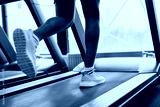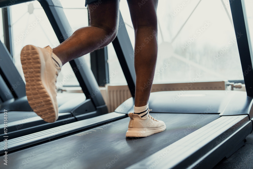 Focused runner exercising on treadmill in modern gym with natural light and urban background