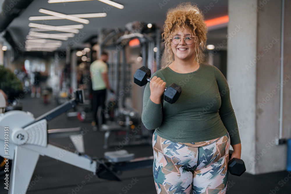 Curly Haired Woman Lifting Dumbbells In Bright Modern Gym With Exercise Equipment