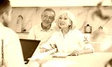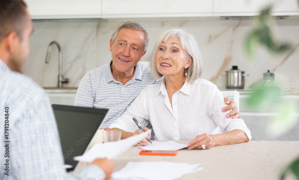Couple of elderly man and woman discussing deal with male salesman in kitchen home