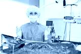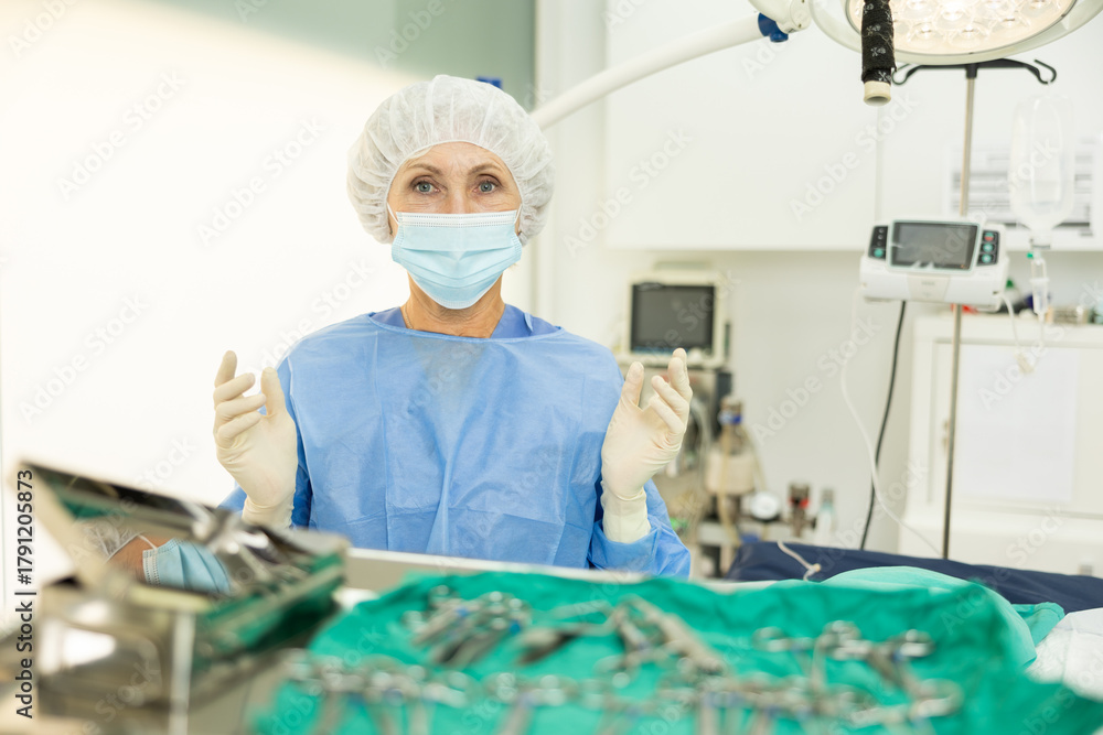 Professional aged female veterinarian in sterile coat, cap, mask and gloves preparing to conduct surgical operation at veterinary clinic, standing by operating table, confidently looking into camera..