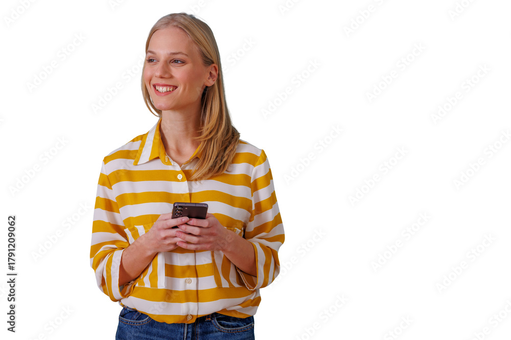 Young woman smiling, holding smartphone, engaged in digital communication, connecting online on a transparent background