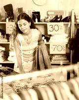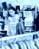 Search and selection of new jeans in a clothing store for a young woman