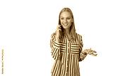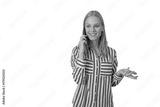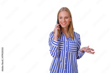 Young woman having a happy mobile phone call, smiling while gesturing, digital communication, transparent background