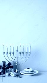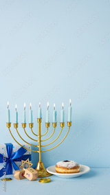 A vertical festive Hanukkah scene featuring a gold menorah with lit candles, wrapped gifts, a dreidel, coins, and a powdered donut on a plate against a soft blue backdrop