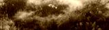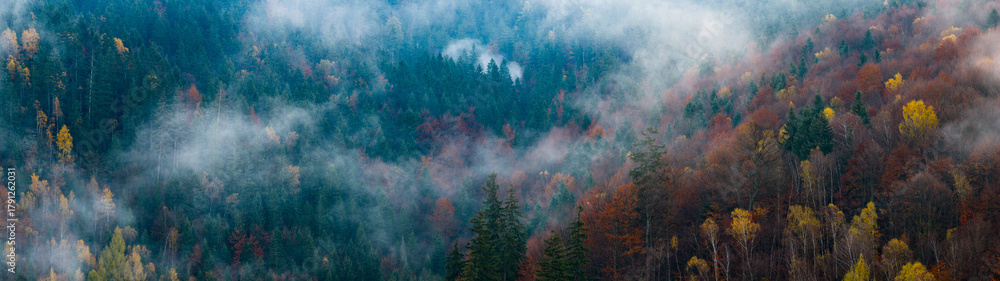 Beautiful mountain landscape in fall with colorful trees and white fog , aerial view . Misty forest