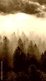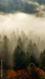 Beautiful mountain landscape in fall with colorful trees and white fog , aerial view . Misty forest