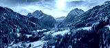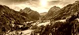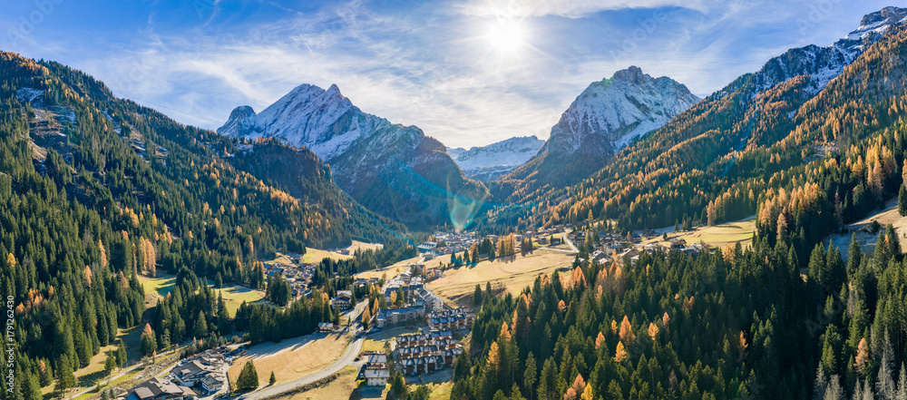 Panorama of the Dolomites mountains with Canazei town during autumn. Beautiful mountians of Alpi Dolomiti in Italy, South Tirol