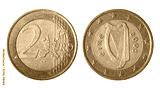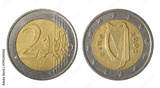 Isolated photo of 2 euro Ireland 2005 bi-metallic coin obverse and reverse on white background.
