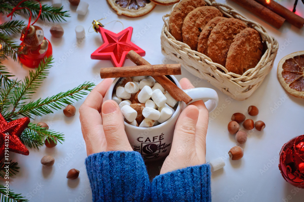 the girl's hands hold a cup of cocoa with marshmallow and cinnamon
