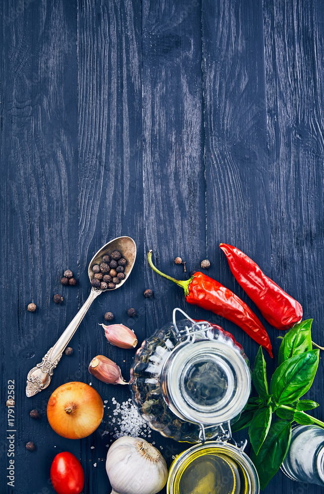 Spice and herb on old blue wooden board in rustic style