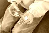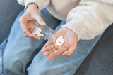 Sick asian young woman, girl holding tablet pill on hand pouring drug from medication bottle, painkiller medicine from stomach pain, head ache, pain for treatment, take drug or vitamin, health care.