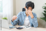 Eye problem concept, fatigue asian young man, male tired eyes, irritated rubbing nose, relief vision pain after work on laptop computer, eye strain, hand holding glasses, suffer migraine, bad blurry.
