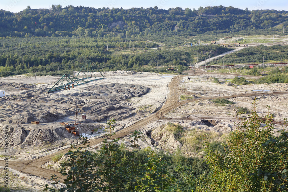 Quarry for amber mining. Amber combine excavation of solar stone from the ground. Earthwork in a career. Baltic amber is a fossil mineral. Excavators in the quarry of the city Yantarny