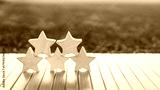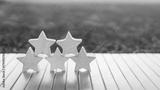 Stacked five wooden stars on table with green background symbolizing high rating, excellent review, top quality, trust, performance ranking, brand credibility, and customer satisfaction.