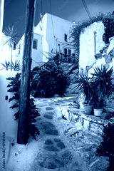 Streetview of Mykonos with white houses with blue windows.