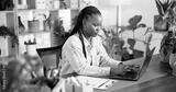 Black woman, florist and typing on laptop for small business, inventory or online order for ecology. Plant shop, computer and person in office for stock, sales or review info in sustainable startup