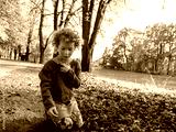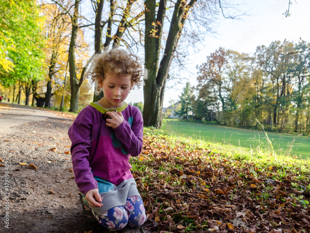 Mała dziewczynka zbiera kasztany w jesiennym parku.