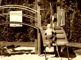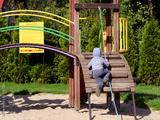 Mały chłopiec bawi się na placu zabaw w jesienny słoneczny dzień.