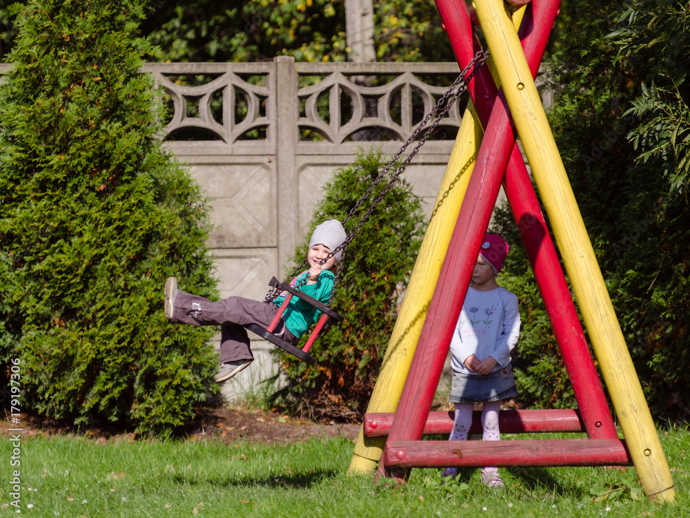 Mama huśta dziecko na huśtawce na placu zabaw w jesienny dzień.