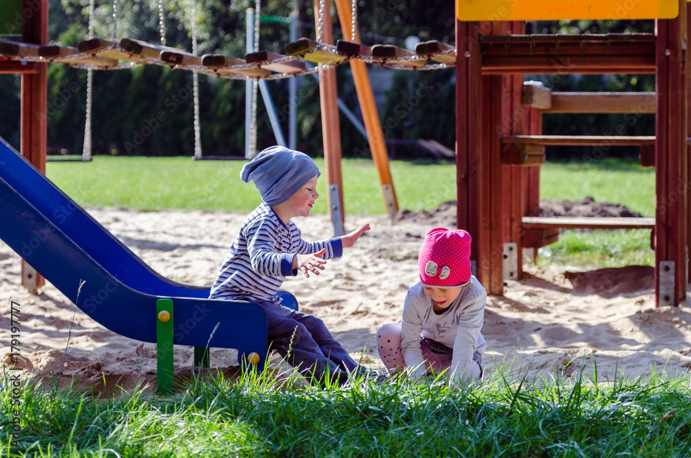 Rodzeństwo dzieci bawi się na planu zabaw w jesienny słoneczny dzień.