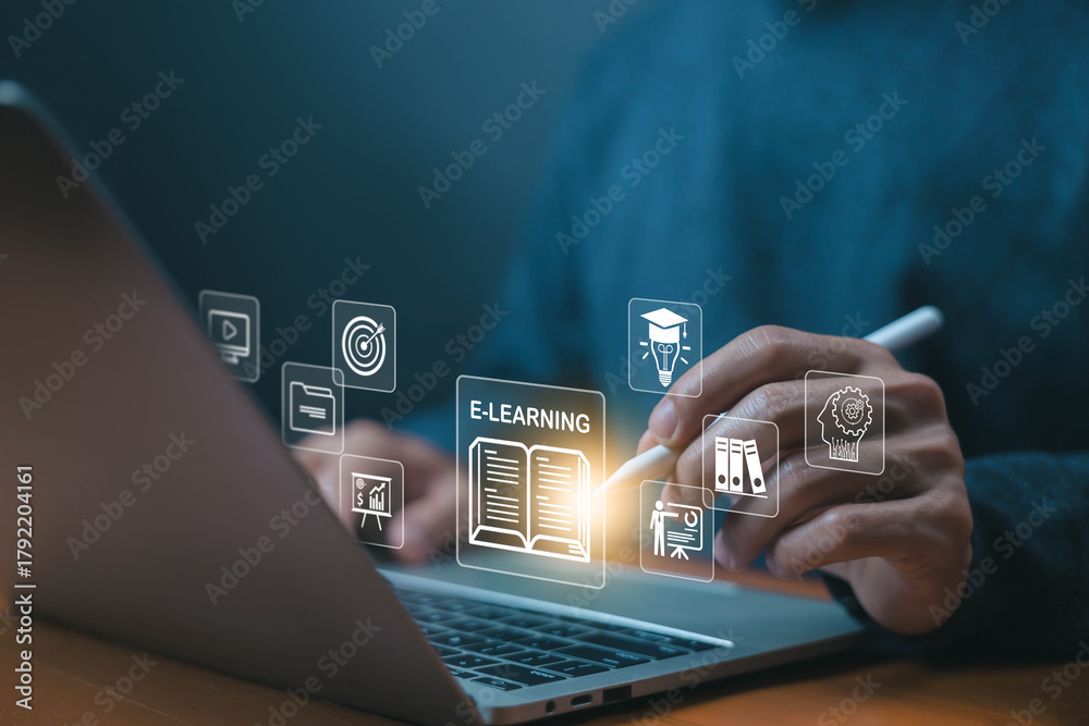 learn icon, online training on a laptop. concept of platform digital education, teaching course. curriculum learning online, business technology. a study from the webinar, Innovation Elearning