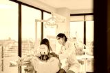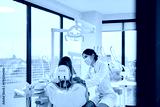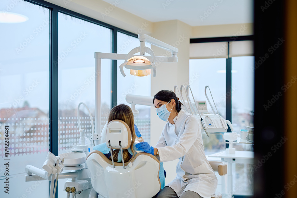 Dentistry professional in a mask and gloves preparing to examine a female patient in a modern dental office
