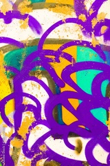 Vibrant graffiti art featuring bold purple swirls on a dynamic yellow background. 80s, Y2K style, urban, trippy vibe. Street art, digital designs, funky posters, creative banner.