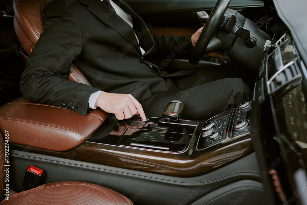 Caucasian middle aged man sitting in luxury car, wearing business suit, operating gear selector with right hand, showing partial view of interior and steering wheel