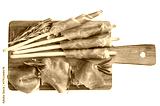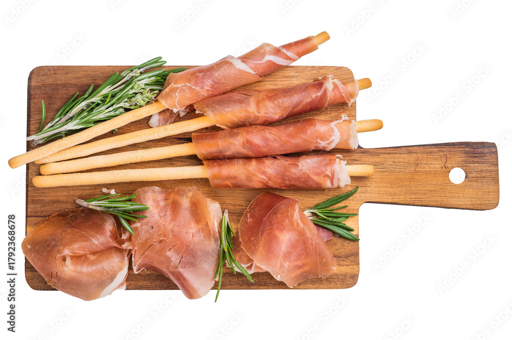 Italian Prosciutto Crudo and Grissini (breadsticks) on a wooden board, garnished with fresh rosemary. Classic antipasto starter.