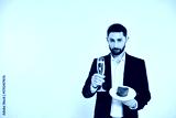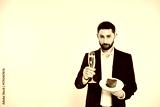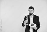 Bearded man in elegant suit celebrating love with dessert on Valentines Day