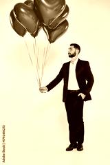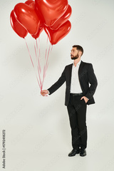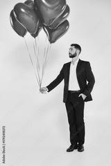 Elegant man in a suit holding red balloons for a romantic Valentines Day celebration