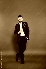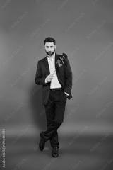 Romantic man in suit holding rose against vibrant red backdrop for Valentines Day