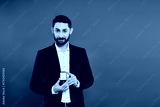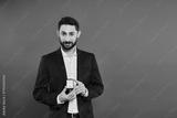 Romantic man in elegant suit holding an engagement ring on Valentines Day
