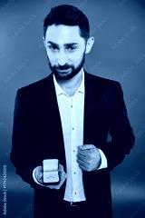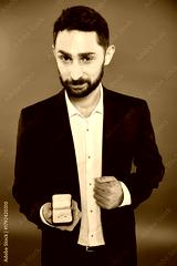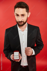 Romantic man in elegant suit proposing against vibrant red backdrop for Valentines Day