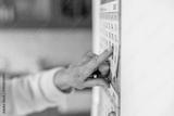 Senior woman using a wall calendar in her kitchen, focus on finger