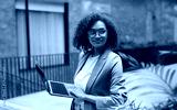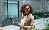 diverse female analyst holding laptop and smiling with visible charts, analytical focus in corporate atrium,