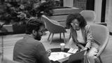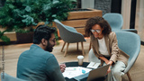 two colleagues analyzing documents at table, cross-referencing charts and metrics while developing strategy