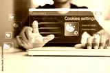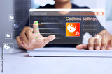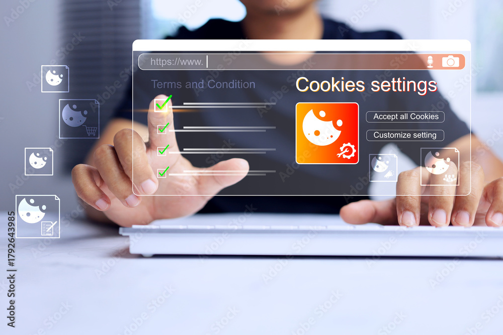 web browser cookies setting concept with a man in black tick checkmark on terms and condition on virtual screen on desktop